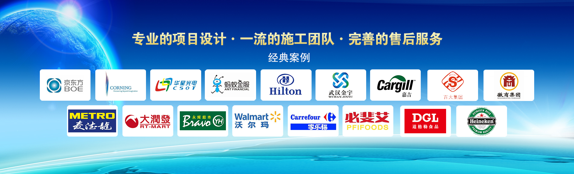 冷凍冷藏設備大型冷庫項目: 武漢中百物流冷庫(40000㎡)、蘇州、北京普洛斯大型物流庫(17000㎡)、沈陽佳德物流冷庫(20000㎡)、上海東航配餐物流庫(6000㎡)、杭州華商勾莊物流冷庫(24000㎡)、安徽安心蔬菜綠色食品冷庫(12000㎡)、武漢金宇冷庫(35000㎡)、必斐艾食品廠(14000㎡)、中國-東盟(百色)農產(chǎn)品交易中心冷庫物流工程(30000㎡)、遵鐵物流冷鏈物流區(qū)建設項目中心冷庫物流工程(16500㎡)、長沙云冷產(chǎn)業(yè)園冷庫物流工程(21000㎡)等;大型中央空調項目: 武漢康寧顯示玻璃廠廠房、武漢京東方模組廠房、武漢華星光電模組廠房、深圳華星光電模組廠房,杭州阿里巴巴辦公樓,舟山波音737機場辦公樓,南京江北能源站、上海金融大酒店等
